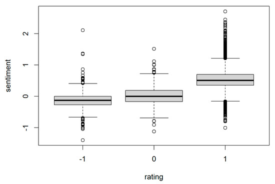 At the individual level, we used the R package SentimentR to assign sentiment scores to textual comments associated with each rating. Table 2 lists a few examples of negative, neutral, and positive ratings. For the first row, the comment associated with a negative rating has a sentiment score of −0.124, the one associated with a neutral rating is −0.08, and the one associated with a positive rating is +0.632.