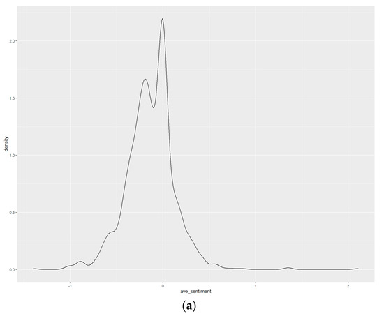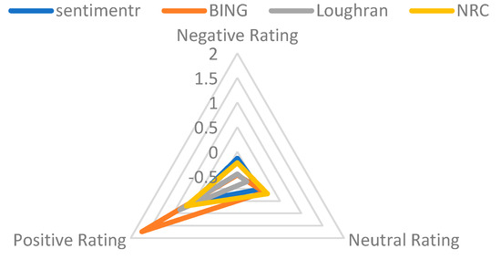There are two ways to conduct sentiment analysis: corpus-based and lexicon-based [38]. Corpus-based analysis uses the texts/corpora representing a paragraph to determine the sentiment types (negative, neutral, or positive) derived from text contents. A lexicon-based method uses an existing lexicon or dictionary to determine text contents’ sentiment types (negative, neutral, or positive). Ref. [39] showed that the two approaches produced similar accuracy in some cases. There are various lexicon methods available for sentiment analysis at present. In this study, we chose to use four lexicon methods: SentimentR, Bing, Loughran, and NRC, since they are widely used in both academia and industries.