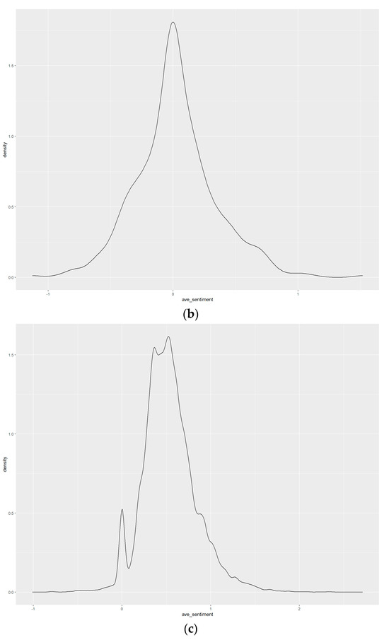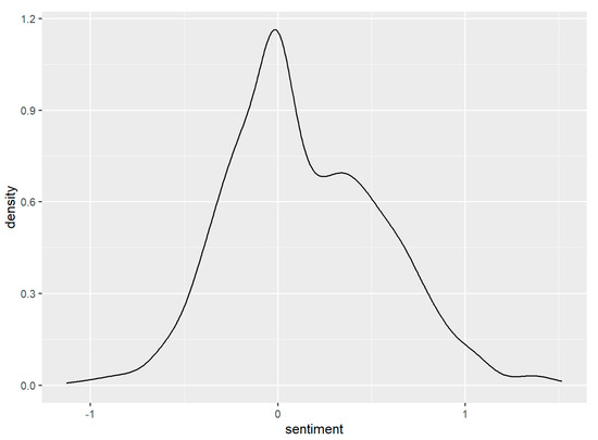At the individual level, the sentiment score distributions of negative, neutral, and positive feedback ratings are depicted in Figure 4a–c. While each one has a tall spike around the mean value, they also spread to both sides. To better view the distribution of sentiments for the three types of feedback ratings, we chose 481 samples of neutral ratings and randomly selected 481 negative and positive ratings, respectively. Then, we combined them into one dataset. The density chart of sentiments is shown in Figure 5. The distribution expands to both the right and left sides. The mean value of sentiments for this combo is 0.1423, and the p-value < 0.01, which suggests the density skews to the right. This is evidence that the three simple types of feedback ratings (−1, 0, +1) cannot fully align with the sentiments revealed in the comments posted by buyers.