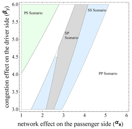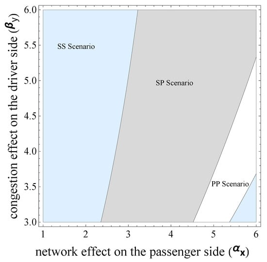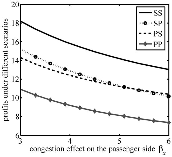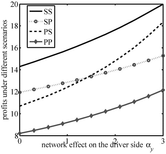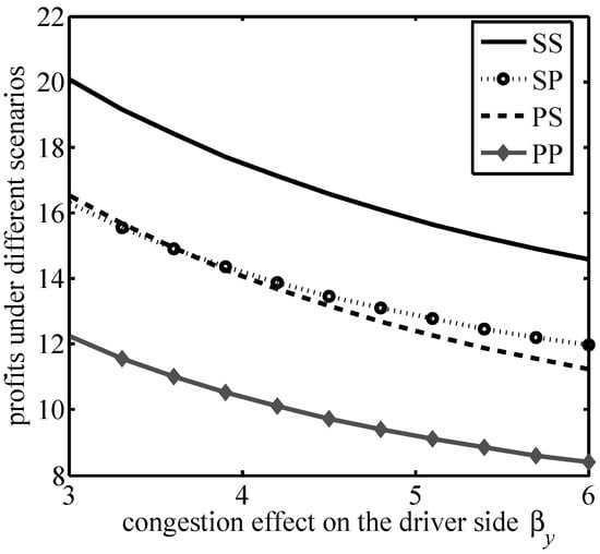 When the cross-group network effects on both sides are large, the PP scenario makes the highest profit. As the congestion effect on the driver’s side increases, the SS scenario makes the highest profit, followed by the SP scenario. Finally, when the inter-group network effect on the passenger side is small and the inter-group network effect on the driver side is large, the SS scenario makes the highest profit. As the congestion effect on the driver side increases, the PP scenario makes the highest profit, followed by the PS scenario.
