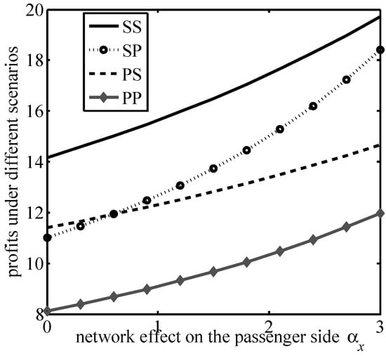 Figure 5 and Figure 6 compare the profits of the ride-hailing platform in the four scenarios. First, for the overall trend, Figure 5 and Figure 6 show that the platform is able to make the highest profit in each scenario. Second, the results of the profit comparison between the four scenarios depend on the cross-group network effects and congestion effects on both the passenger and driver sides. When the cross-group network effects on both sides are small, the SS scenario makes the highest profit. As the cross-group network effect on the passenger side increases, the SP scenario makes the highest profit, followed by the PP scenario.