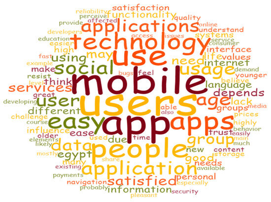 To achieve the research aim, the inductive approach with qualitative design was followed, where a semi-structured interview was designed. A number of 13 questions covering the factors affecting the implementation of a mobile application were developed. Table 1 shows the interview questions posed to a targeted sample of technology experts and customers with technological experience in Egypt. The questions were posed to a number of experts until redundancy of data occurred. This indicates that the sample was abundant, with no need to continue with more interviewees. NVivo (version 12) software was used to analyze the interviewees’ responses. NVivo is a software package used for qualitative analysis. NVivo has a user-friendly interface and a variety of capabilities that allow for in-depth study and comprehension of data from qualitative studies [54,55]. Researchers may use the flexible coding system to analyze data at the granular level, detect trends, and reveal important insights [56,57]. In order to obtain better knowledge of their study material, users may code certain segments, transcribe audio and video recordings, and analyze visual data using the software, which also facilitates the analysis of multimodal information [58,59]. Ref. [60] found, in a recent study, that NVivo software is frequently regarded as a helpful tool for streamlining qualitative analysis. NVivo is a tool that was created especially for examining and classifying text-based data. It has a number of functions, including the ability to code and extract data for thematic analysis. The software also has features that allow researchers to link different codes or categories of data, making it easier to develop conceptual frameworks and even hypotheses based on the data.