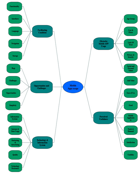 At this point, the research questions were mixed in with the initial four themes to include users, mobile, app, easy, technology, and application. The researchers chose five themes from the research objectives to answer the research questions, including perceived usefulness, facilitating conditions, obstacles to mobile app usage, technology and information system usage, and opportunities and challenges.