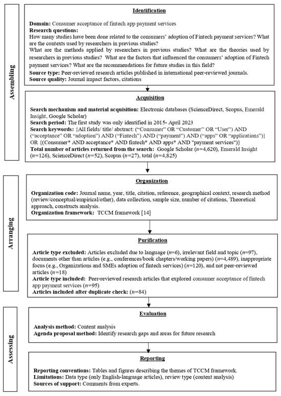 The first stage of this research protocol is called the assembling section, which includes the identification and acquisition of the literature [13]. In the present study, the assembling includes the identification of previous research on the acceptance of fintech app payment services from the consumer’s perspective. This research focuses on peer-reviewed research articles published in international journals listed in electronic databases, including ScienceDirect, Scopus, Emerald Insight, and Google Scholar [19,20,21]. As examining fintech acceptance and adoption by consumers is recent, the first study was identified in 2015, with others following, up to April 2023. Furthermore, as the purpose of this study was to undertake a complete search aiming to develop the present literature and knowledge on consumer acceptance of fintech app payment services, a number of keywords were used in the search. In the first screening, we used the following keywords: (Consumer* AND acceptance* AND fintech* AND apps* AND “payment services”). This search was accepted in Google Scholar and Emerald Insight. However, ScienceDirect and Scopus do not accept the * symbol. Accordingly, a second screening was based on the following keywords: (“Consumer” OR “Customer” OR “User”) AND (“acceptance” OR “adoption”) AND (“fintech”) AND (“payment” OR “payment services”) AND (“apps” OR “applications”). The total number of articles returned from the search based on each database is as follows: 4620 from Google Scholar, 126 from Emerald Insight, 52 from ScienceDirect, and 27 from Scopus, making a total of 4825 articles. While ScienceDirect, Scopus, and Emerald Insight are reliable databases and have features that allow the researcher to limit the searching process to only peer-reviewed articles, Google Scholar helps in achieving a wider range of scholarly articles that are published by various renowned academic and scientific publishers, such as EBSCO, Springer Link, ProQuest, Taylor and Francis, SAGE, and many others. Using Google Scholar required a massive effort in the later stages in order to include only peer-reviewed articles and exclude other documents.
