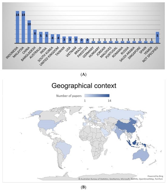 The geographical context of the reviewed articles is presented in Figure 4A,B. As shown in Figure 4A, the highest number of papers were produced in Indonesia and Malaysia (14 articles each), followed by China (ten articles). Other commonly considered countries are Bangladesh (six articles), followed by Australia and India (five articles each), the United Kingdom and South Korea (four articles each), and USA, Vietnam, and Taiwan (three articles each), while Brazil and Pakistan have two articles each. Other countries have been considered just once: Germany, Hungary, Jordan, Maldives, Portugal, Romania, Russia, Saudi Arabia, Singapore, Spain, and Yemen. Overall, as Figure 4B illustrates, most of the studies are concentrated in Southeast Asian countries.