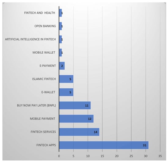 In terms of the context, based on the research theme/topic of the paper, Table 3 presents the identified themes within the fintech application adoption context and the references. Furthermore, Figure 5 shows that most of the articles (31) have considered the fintech apps without specifications; 14 have examined fintech services; 12 have studied mobile payment; and 11 recent articles have focused on the BNPL payment services. E-wallet and Islamic Fintech have also been an area of focus by five articles each. E-payment was considered twice, while the remaining themes (Fintech and Health, Open Banking, AI Fintech, and Mobile wallet) have appeared only once.