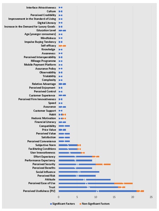 The literature shows a number of constructs (49) that have been significantly associated with the acceptance of fintech payment services (as a dependent variable), with behavioural intention as an independent variable; these constructs are presented in Figure 6. The factor that has been examined most in the reviewed literature and been found to have a significant association with fintech payment services is perceived usefulness (21 times); only two papers found that this factor does not have a significant impact. Trust is the second highest significant factor in the acceptance and adoption of fintech payment services (16 times); again, only two papers did not support such results. The third most examined construct is perceived ease of use (15 times); although five articles claimed the opposite results. Fourteen studies found significant association between attitude and behavioural intention. Eleven studies have examined social influence and found it to be significant in the fintech adoption context. Both perceived risk and perceived security were shown to be significant by some studies (ten times for each factor). Performance expectancy, effort expectancy, and perceived benefits are also commonly examined factors, where most papers tested them (nine articles for each) and supported their significance; only two articles found effort expectancy to be not significant. Figure 6 presents all the factors that showed a significant association with the acceptance and adoption of fintech payment services, where each factor is classified as supported if the factor is found to be significant, and not supported if it is insignificant. Table 4 presents the 17 factors that have been examined in the adoption of fintech payment services, with citations for the supported and not supported factors.