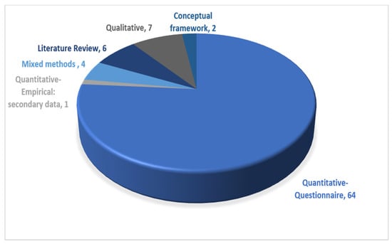 The methods used in the reviewed studies are summarized in Figure 7. It can be seen that most of them used a quantitative approach, particularly primary data/questionnaire (64 times). The results also show that seven articles used a qualitative approach, and six applied a literature review approach. The mixed method approach was used by four articles. Only one article in the reviewed literature relied on secondary data, and one applied a conceptual framework. Table 5 provides more details of the papers’ citations, divided based on the research methods used. Most articles have used Quantitative (Questionnaire), followed by Qualitative (Content Analysis) and Literature Review. A few papers utilized Mixed Methods (Questionnaires and Interviews), and two studies utilized a conceptual framework.