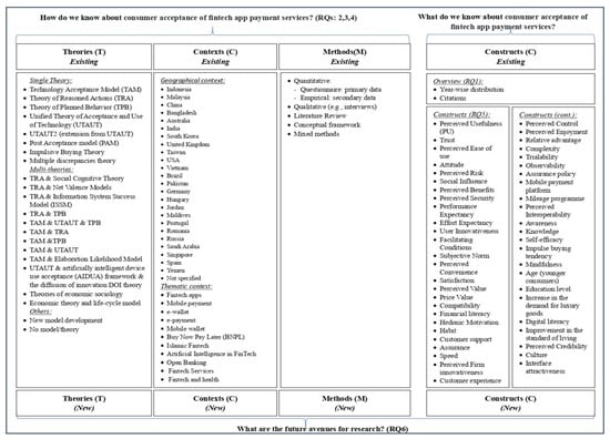 This section discusses and analyses the results of the previous section, and hence answers the research questions. RQ1 was addressed by applying an SLR to observe the relevant existing literature on consumer acceptance of fintech app payment services. To achieve this goal, the researchers used the proposed protocol by [13], namely SPAR-4-SLR, to conduct the study in three stages (i.e., assembling, arranging, and assessing), as well as six substages (i.e., identification, acquisition, organization, purification, evaluation, and reporting). The study was conducted without specifying a timeframe, up to April 2023. Based on keyword searches and the inclusion and exclusion of the identified articles, 84 peer-reviewed research articles were identified that are published in international journals listed in electronic databases including ScienceDirect, Scopus, Emerald Insight, and Google Scholar from 2015 to April 2023 [19,20,21]. After that, an analysis of the geographic distribution of the published articles was used to address RQ2. The results indicate that 24 countries have been considered when examining the acceptance of fintech payment services. Most of the studies are in Indonesia, Malaysia, and China. A possible reason for the high attention in these countries is the high level of fundraising in this sector by investors who have paid great attention to fintech. Moreover, the young, unbanked population in these countries has fuelled an increase in fintech adoption [99]. Additionally, governments’ motivations and efforts in developing a qualified infrastructure for fintech payment services in these countries might be another reason for the higher adoption by consumers. However, fintech payment services are highly supported by other countries’ governments and are used by consumers in their daily lives. Hence, further countries need to be considered and examined. RQ2 was also addressed by another context classification, i.e., the theme/topic of the identified studies; the results indicate that most of the studies have not specified a certain fintech payment service or app. This might be in the hope of more generalization of the results. However, this is a fast-growing sector, and many services and apps options are being released, which signifies the importance of greater specification. Although the BNPL theme is very recent (2020 onwards), it is receiving attention from academia, as 11 articles considered this theme. The Islamic Fintech theme is also considered by some articles, given that fintech is highly considered in Malaysia and Indonesia, which are both Islamic countries. RQ3 was addressed by analysing the methods applied by researchers in previous studies. Most of the studies relied on primary data (questionnaire). A possible reason for this is that fintech payment services are considered to be emergent, therefore reaching the users through questionnaires can reflect their insights and perceptions. However, there is a clear need for secondary data analysis, as consumers’ perceptions might differ from one country to another, and secondary data can be a better approach to generalizing the results. Moreover, the mixed-methods approach is rarely used, though it can actually provide a more thorough understanding. A conceptual framework was used only twice, although it, too, can provide a better understanding of this recent topic. The analysis of theories used by researchers in previous studies (addressing RQ4) indicates that a limited number of theories and models have been used when examining the acceptance of fintech payment services, mostly TAM and UTAUT. The high usage of these two theories might be due to their significance and popularity in examining technology acceptance and the adoption of new and modern technologies in different contexts [100]. Hence, many researchers adopted TAM or UTAUT, and some added a few constructs to those in the adopted theory. The analysis also shows that many of the studies did not specify any theory or model (16 times), while a few of them incorporated two or more theories. The limited number of papers that used a combination of theories might be due to the complexity of building such a combination with logical reasoning. The analysis of theory trends since the emergence of fintech services reveals that in the initial years of 2017–2018, the primary focus was on applying the TAM as the theoretical framework. Subsequently, in 2019, scholars increasingly utilized UTAUT. From 2020 onwards, researchers began to explore other theories and models such as the TPB and the TRA. Additionally, some researchers have sought to integrate multiple theories in their efforts to gain a more nuanced understanding of consumer acceptance of fintech services. Nevertheless, TAM and UTAUT also have still been used in recent years, with additional constructs. Understanding the evolution of theoretical trends in the field of fintech adoption can be highly beneficial for marketers and the banking industry. This knowledge can help them develop effective strategies, stay up to date on emerging frameworks, and enhance consumer engagement.