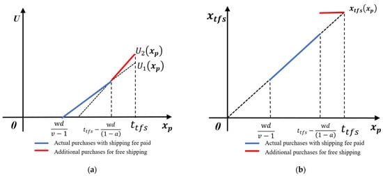 Apart from MFS, TFS can also promote consumer purchases and increase the sales of online retailers, so it is widely used in online sales [,,]. The wide range of this marketing policy has attracted much research attention. Past studies have shown that TFS affects consumers’ purchase decisions []. When the purchase amount is less than the TFS threshold, consumers have a strong willingness to add purchases to obtain free shipping. The main factor affecting this willingness is the delivery (distribution) cost and threshold. Lewis et al. demonstrated that TFS can increase the purchase amount of customers’ orders. In terms of marketing policy, the threshold can be the number of purchased products []. Huang and Cheng showed that piece-based threshold free shipping is more effective than dollar-based shipping []. Li et al. found that to make the shopping amount reach the threshold, online retailers can provide additional shopping recommendations to improve consumers’ willingness to buy [].