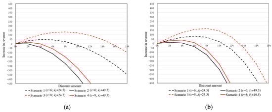 From Equation (5), we know that is a first-order function of , and the first-order derivative is less than zero. From and , we obtain the optimal discount duration as follows: