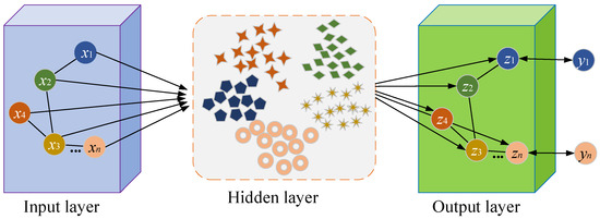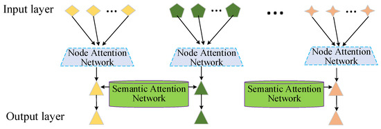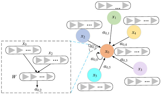 In Equation (5), refers to the vector-splicing operation, denotes the learnable parameter matrix, and is the mapping function. and refer to the feature vectors. After obtaining the weights of neighboring nodes using GAN, the neighborhood weight is normalized using the softmax activation function, as defined in Equation (6):