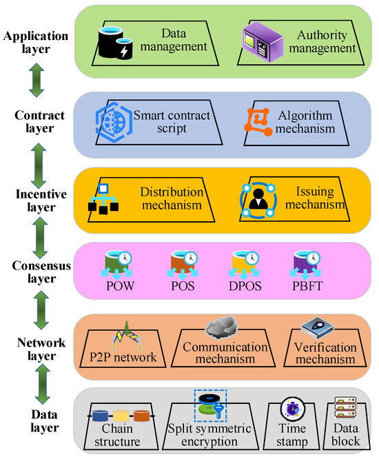 In the realm of financial transactions, ensuring data privacy holds paramount significance. Blockchain technology, distinguished by its decentralized, highly secure, and tamper-resistant distributed ledger system, presents an innovative solution for safeguarding the privacy of financial transaction data [29]. Its structure comprises six layers: the application layer, smart contract layer, incentive layer, consensus layer, network layer, and data layer, as depicted in Figure 4.