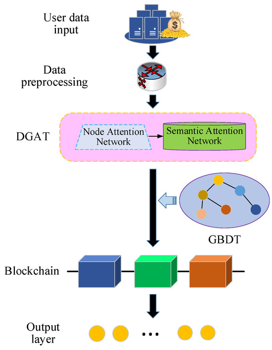 As illustrated in Figure 5, upon inputting user transaction data, the initial step involves preprocessing financial transaction data. This encompasses data cleaning, feature extraction, and transformation, converting transaction data into a graph representation with nodes and edges. Subsequently, the Dual-Head Attention Network module, combining the NAN and the Semantic Attention Network, is employed to handle transaction relationships within the data. The data processed through DGAN is then fused with the GBDT, specifically utilizing the GBDT-DGAN network to identify data information features of user transactions in the network. Finally, the model output data is integrated with blockchain technology, recording it on the blockchain to protect privacy information and ensure data integrity. In the blockchain network, zero-knowledge proof technology is utilized to construct trusted zero-knowledge proofs [34]. This enables the network to publish keywords required by users, regulatory agencies, and financial institutions for querying. Smart contracts verify whether the user transaction data provided in the blockchain meets anti-fraud requirements. Ultimately, the transaction data receives a label indicating fraud or security after model prediction.