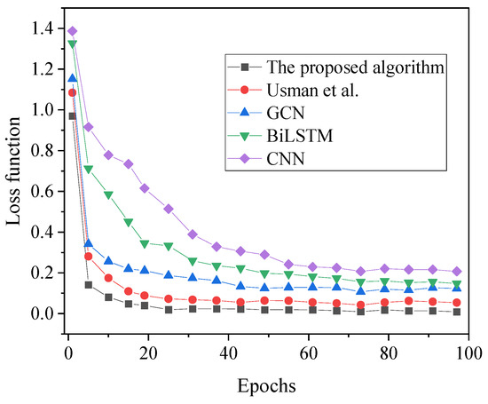 To assess the performance of the model proposed in this article, the model algorithm was compared with GCN, BiLSTM [35], CNN [36], and the model algorithm proposed by Usman et al. [17]. (2023) from related literature. An evaluation was conducted based on convergence, precision, recall, F1 score, and data transfer security metrics.