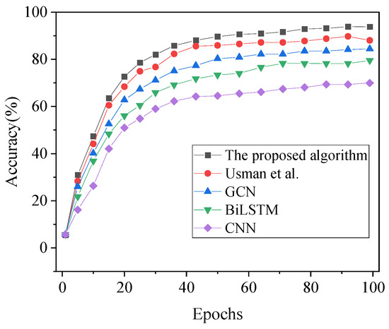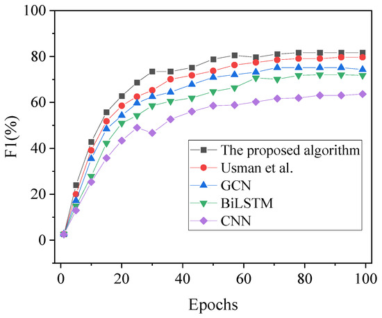 The recognition performance of the model proposed in this article is compared with GCN, BiLSTM, CNN, and the model algorithm proposed by Usman et al. (2023) [17] from related literature. The convergence situations are illustrated in Figure 6. Further comparisons are made for precision, recall, and F1 score, and the results are presented in Figure 7, Figure 8 and Figure 9.