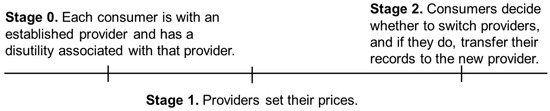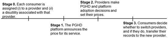 Assuming that the providers handle PGHD integrations themselves in the absence of a platform, the sequence of events is as follows. In the first stage, consumers are assigned to their providers with an associated disutility. In the second stage, the platform announces the price that it charges to providers for its service (). In the third stage, providers simultaneously decide whether to aggregate their patients’ PGHD themselves or whether to join the platform. They then announce their prices ( and ) for delivering healthcare. Finally, given the switching costs and PGHD strategies of the providers, consumers decide which provider to work with and transfer their records if necessary. These stages are illustrated in Figure 2.