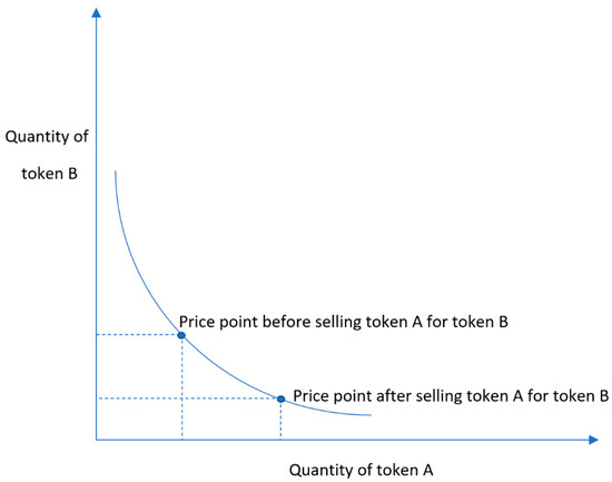 Uniswap is the company that created the Uniswap protocol, the first AMM, an open-source SC that uses liquidity pools to ensure that users can exchange tokens [25]. A simple explanation of the protocol is that liquidity providers act as the main entities, providing the tokens (in pairs) to the SC and earning a commission from each trade. Supposing that an SC holds a quantity of tokens A and B at a point in time, each new trade would automatically modify the amounts inside the SC, as presented in Figure 1.