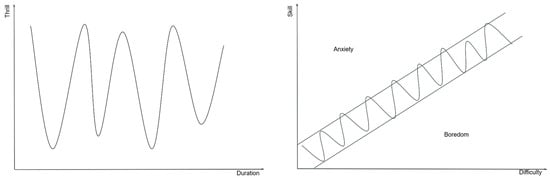 Game design works with two types of flow: the microflow and the macroflow. The microflow is a state of mind where the player experiences intense and focused enjoyment and fulfilment through a series of successful achievements. The microflow has three key elements: gameplay rhythm, the virtuous circle effect, and positive feedback. The gameplay rhythm refers to the relationship between player inputs and a rhythm pattern. The idea is to allow users to give a sequence of inputs unconsciously, thus encouraging dopamine secretion. The virtuous circle effect involves having gameplay mechanics that encourage players’ continuous success, keeping them in the perception loop that reassures them they are better than expected. Lastly, positive feedback and rewards maintain player engagement by providing intrinsic reinforcement for their actions. The microflow lasts for a short period but can repeat over time. In video games played on desktop computers, microflow can last about 10–15 min, whereas in mobile apps, microflow was measured to 3–4 min [41]. Over a game-playing session, microflow looks as presented in Figure 2 (left). When referring to P2E games, the peaks of the microflow function may, e.g., coincide with the time frames when users obtain token rewards.