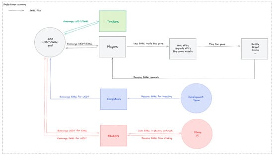 In single-token play-to-earn economies, the game uses one token as both the in-game currency and the reward for players. This token can be used to purchase items, do upgrades, buy buffs and other types of enhancements. It can also be used for player-to-player trading and converted to real-world currency. Examples of games with single token play-to-earn economies include The Sandbox and Cryptomines. In Figure 3, we present a basic architecture for a single-token economy with four types of stakeholders: players, traders, investors, and stakers.