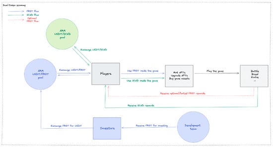 In Figure 4, we present the fluxes of the tokens from a standard dual-token P2E economy. For simplicity, we removed from stakeholders the staker and the trader types, as they have the same activities and follow the same objectives as in single-token economies.