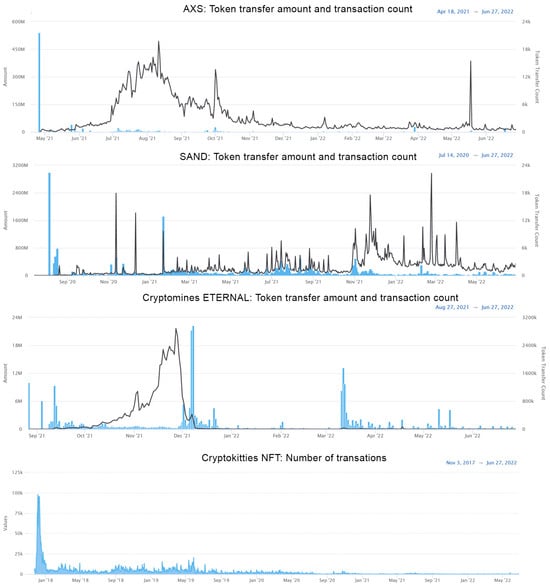 Although the revenue models presented above satisfy the purpose of gathering the funds from users and distributing them to the producing companies, for some of the games and depending on the context, a functionality that could allow users to share or trade in-game assets was missing. Several attempts have been made to solve this issue. For example, several third-party entities created forum-like marketplaces for successful multiplayer games, where players could list their items or participate in auctions with real currency. At the same time, the trading process would be completed inside the actual games. This process was laborious and not entirely safe, but it could, for the first time, allow players to earn from playing. For example, a digital good from the renowned game Second Life was sold on eBay for USD 50,000 in 2007 [14]. Most of the time, however, the makers of the games were not happy with trading digital goods outside the game itself. Many auctions and trades resulted in user bans. Following this turn of events, in some cases, the companies producing the games started to offer marketplace sections, some even making use of an in-game currency [15]. However, the problem of transporting the value produced inside the game to the outside world was not solved, as in most cases, the primary beneficiary remained the entity who created and owned the game, mainly due to financial reasons. For example, buying and selling digital goods inside a game is a thriving revenue venue for Activision Blizzard, as microtransactions (in-game transactions) amounted to USD 5.1 billion in 2021 [13]. It is also worth mentioning additional ways of earning revenue from classic online games, such as competitions, tournaments, or other types of events. Although we acknowledge their financial potential (e.g., in the latest Dota competition, the prize pool was USD 19 mil) [16], these are not connected to the in-game economy, and are in most cases used as a marketing vehicle.