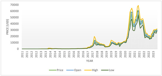 The other dataset used in this research consists of the monthly prices of Bitcoin extracted from Investing.com (accessed on 23 June 2023). The Bitcoin prices started to increase in 2017 and then again in 2019, but the highest jump was recorded in 2021. The price curve in 2021 had two humps followed by a steep valley in 2022 down to almost 15,000 USD. Today, prices are half of what they used to be in 2021 when they went up to almost 70,000 USD (as in Figure 2).