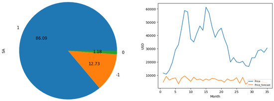 The Bitcoin price direction was predicted using a linear discriminant analysis-based classifier and sentiment analysis [40]. Price information and crypto-related news headlines were collected to forecast the day-ahead price direction. The SVM outperformed the other forecasting algorithms. However, all of them show better accuracy when predicting an increase in the day-ahead price compared to forecasting a decrease in the price. The inclusion of news sentiment increased the accuracy by 0.585. News and information from social groups in financial markets were investigated in [41]. The authors analyzed the relationships between moods and price time series to predict prices. The sentiment moods were calculated using the probability distribution of the news and were vectorized using a BERT-based transformer language model. Recurrent neural networks were employed to forecast the prices. Additionally, 15,000 tweets on cryptocurrency were analyzed from the emotional point of view evaluating the emotion score for anger, anticipation, disgust, fear, joy, sadness, surprise, trust and the two basic sentiments: negative and positive. A total of 53,077 sentiments were extracted from the 15,000 tweets. The results showed that the data sample consisted in positive sentiments that might lead to an increase in investment in the decentralized finance market. This study indicated how ML algorithms measured the emotions from tweets to understand the implications of cryptocurrencies’ prices [42].