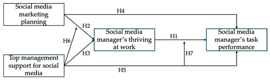 The conservation of resources theory, similarly to Spreitzer et al.’s [12] model, is a motivational framework that examines constructs that have a relevant impact on employees’ well-being [55]. The conservation of resources theory suggests that employees strive to acquire, maintain, and develop resources that are valuable for meeting the demands associated with their roles and for protecting against resource depletion. Hence, the conservation of resources theory posits that individuals invest resources to protect them from resource loss, aid in recovery from loss, and gain new resources [54]. Under this perspective, resources are defined as objects, personal characteristics, conditions, or energies that are relevant to adaptive functioning [20]. Perceived organizational support, opportunities for development and learning, etc., are considered job resources [56,57,58], while intrinsic motivation, optimism, etc., are considered personal resources [59,60]. Therefore, from the conservation of resources perspective, social media marketing planning, top management support, and thriving at work can be considered resources. The research model proposed is depicted in Figure 1.