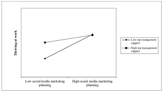 According to the replacement hypothesis of the conservation of resources theory [20], when one resource is scarce (e.g., social media marketing planning), employees can use another resource (e.g., top management support) to compensate for it. For social media managers, having top management support allows them to work in safe work environments where they feel motivated to take risks [70], contributing to their learning and enhancing the quality of their work relationships and the meaning of their work [71], thus promoting their vitality [76,95]. Therefore, top management support, by contributing to the learning and vitality of social media managers, could compensate for the effect of underdeveloped social media marketing planning on the thriving of social media managers at work. Conversely, when top management support is lacking, social media managers may need the company to have highly developed social media marketing planning to experience well-being in terms of thriving at work. Therefore, the relationship between social media marketing planning and the thriving of social media managers at work may vary at different levels of top management support. Similarly, top management support is likely to compensate for lower levels of thriving at work in the case of the task performance of social media managers. Top management support enhances employee skills through training programs and the promotion of stimulating work environments [49]. It also helps employees to better understand projects [85] and put more effort into the execution of important projects [93], which improves their performance. On the other hand, as the level of top management support decreases, social media managers will need to experience higher levels of thriving at work to increase their task performance.