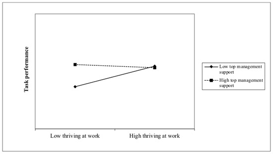 Top management support moderates the effect of thriving at work on the task performance of social media managers; such that the higher the support, the lesser the influence of thriving at work on the task performance of managers.