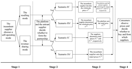 We studied a four-stage game among the platform, an incumbent supplier, and an entrant supplier. In Stage 1, the incumbent supplier chooses a self-operating channel mode, which will either be a reselling one or a revenue-sharing one. In Stage 2, the platform and the entrant supplier determine whether to form a partnership, i.e., the platform decides whether to open its marketplace to the third-party supplier, and the supplier determines whether to join the marketplace. Four scenarios are possible as a result of the first and second stages of this game (i.e., scenario RC, scenario RM, scenario SC, and scenario SM). In Stage 3, pricing decisions of the platform and suppliers are made. Specifically, in scenario RC, the incumbent supplier first determines the wholesale price (wRC), and then the platform and entrant supplier simultaneously determine the retail prices P1RC and P2RC, respectively. In scenario RM, the incumbent supplier first determines the wholesale price (wRM), and then the platform determines the retail price (P1RM). In scenario SC, the platform and the entrant supplier simultaneously determine the retail prices P1SC and P2SC, respectively. In scenario SM, the incumbent supplier sets the retail price (P1SM). In Stage 4, customers observe the product prices and decide whether to buy a product and from which supplier. The time sequence of this game is illustrated in Figure 1.