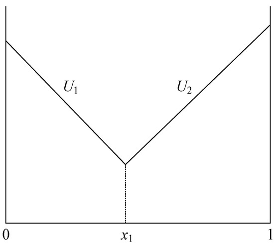 When a third-party supplier enters the marketplace and competes with the incumbent supplier, the consumer surplus of buying the incumbent supplier’s product is U1 = v + s1 + α(v + s1 + 2) − P1 − tx and that of buying the entrant supplier’s product is U2 = v + s2 + α(v + s2 + 2) − P2 − t(1 − x). Out of these two options, consumers choose the one that gives them the maximum surplus under Stage 4. By setting the surplus function as U1 = U2, we can obtain the location point of the marginal customer (). All consumers in the market are divided into two segments. Consumers located in (0, x1) buy from the incumbent supplier, as they derive the higher surplus from purchasing the incumbent supplier’ product than from purchasing the entrant supplier’ product. In contrast, consumers located in (x1,1) choose to buy from the entrant supplier. As a result, we found that and . Figure 3 illustrates the market segmentation in this case.
