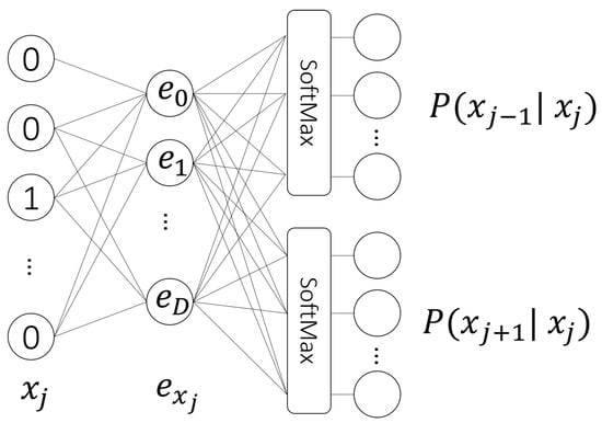 As mentioned above, nowadays, deep learning models for CTR-P mostly consist of an embedding layer to process categorical data and are trained end-to-end. We break with this paradigm and propose a two-step approach based on a pre-trained embedding customer interaction representation which encodes all x in s and a LSTM binary classifier for CTR-P. Our approach is illustrated in Figure 1. The first step of our approach is to train an embedding customer representation. Therefore, we adapted the “SkipGram” approach by Mikolov et al. [55] to train the interaction embedding representation. Figure 2 shows the embedding architecture when using the SkipGram approach, which consists of one input layer, one hidden layer, and one output layer. The input layer is a one-hot encoding of the customer interaction . The hidden layer, which is the embedding representation , consists of D neurons. The output layer size is based on the context size and the number of possible customer interactions and has the goal of predicting the context of the customer interaction .