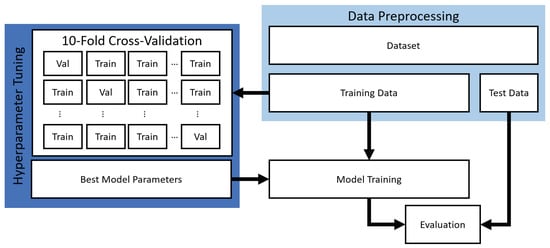 Flow chart of the conducted experiments including data preprocessing, hyperparameter tuning with cross-validation, model training, and evaluation.