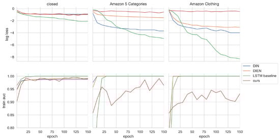 Why does our approach outperform the two state-of-the-art models DIN and DIEN, as well as the LSTM baseline, even though it is structurally almost identical? The cause is likely the pre-trained embedding of customer interaction representation. We train the embeddings task independently in a self-supervised manner and, thus, the embedding was able to learn similarities between customer interactions from the data and the context. In contrast, an embedding input layer learns task-specific patterns and not necessarily the context of the interactions and their meaning. From this, we deduce that the quality of our pre-trained embedding features is significantly better for learning since only the LSTM cells need to be adjusted for CTR-P during training. With the other approaches, several layers have to be adjusted, which for example can lead to the vanishing gradient problem. Evidence is given by inspecting the training loss and score. Figure 4 shows the average log loss and AUC score of the approaches’ CTR-P training. Loss-wise for the Amazon datasets, it can clearly be seen that our approach never reaches a log loss under −1. In fact, it stays almost constant. For the baseline approaches the loss is getting smaller, especially for the LSTM baseline, which can be interpreted as overfitting on the train data. This assumption is supported by the achieved AUC scores of the baseline models. All baseline models reach an AUC score of one after 25 epochs of training. On the other side, our approach never reaches such a high AUC score during training which speaks for a better generalization of the predictor. In the case of the closed dataset, no major difference between the approaches is seen between the loss and the AUC score. This is also evident in the results for the closed dataset.