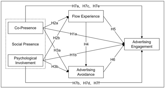 Derived from the proposed hypotheses, this study developed a serial mediation model. The model was established to explore how social presence influences consumers’ advertising engagement and the combined effects of flow experience and advertising avoidance in this influential relationship, as shown in Figure 1.