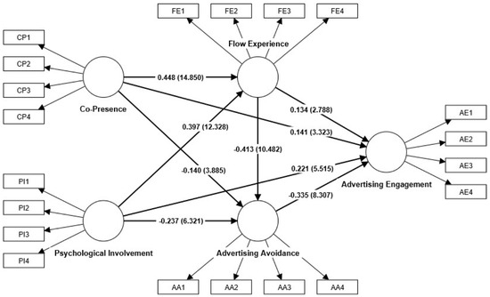 All the measuring items in this study were based on validated items from the existing literature. The expressions were suitably adjusted to align with the specific context of short videos, as presented in Table 1. A small pre-test was conducted to ensure the feasibility of the questionnaire after the items were finalized, and modifications to the questionnaire were implemented based on the input gained from the respondents. The final questionnaire had two parts. The first part targeted respondents’ characteristics. The second part was a 20-item questionnaire about co-presence, psychological involvement, flow experience, advertising avoidance, and advertising engagement. All variables in the second part were measured on a 7-point Likert scale from 1 = “strongly disagree” to 7 = “strongly agree”.