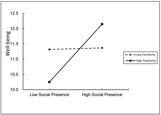 Model 1 in the SPSS macro program PROCESS was used to test the moderating effect of familiarity on social presence and consumer well-being. The results are shown in Equation (1) of Table 4. The product (interaction term) of social presence and familiarity had a significant predictive effect on consumer well-being (β = 0.02, t = 2.79, p < 0.05, 95% CI = [0.01, 0.04]); Model 59 in the SPSS macro program PROCESS was used to test the moderating effect of familiarity on shopping enjoyment and consumer well-being. The results are shown in Equation (3) of Table 4. The product (interaction term) of shopping enjoyment and familiarity had a significant predictive effect on consumer well-being (β = −0.02, t = −2.39, p < 0.05, 95% CI = [−0.04, −0.01]), indicating that familiarity not only moderated the direct effect of social presence on consumer well-being but also moderated the effect of shopping enjoyment on consumer well-being; that is, it moderated the second half path of the intermediary model. Hypotheses 5 and 6 were supported.