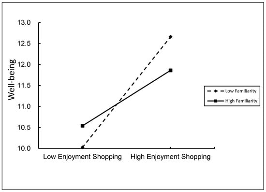 Then, we analyzed the moderating effect of familiarity on the relationship between shopping enjoyment and well-being in the second half of the mediation model (Figure 4). It transpires that the predictive effect of shopping enjoyment on the well-being of consumers with low familiarity (simple slope = 0.28, SE = 0.040, p < 0.001) is greater than that of consumers with high familiarity (simple slope = 0.14, SE = 0.048, p < 0.01). This suggests that the shopping enjoyment of consumers with lower familiarity has a more positive effect on well-being than the shopping enjoyment of consumers with higher familiarity.