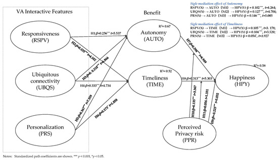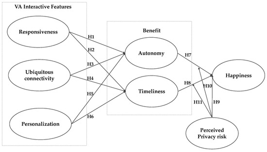 In related research on VAs, Lee [11] identified the components of interactivity as responsiveness, ubiquitous connectivity, consumer control, connectedness, and contextual offers. Alalwan et al. [1] and Baabdullah et al. [12] classified the interaction features of VA from similar perspectives, including responsiveness, ubiquitous connectivity, and personalization. Based on the practical use process of VAs and related academic research fundamentals, this study examines how three important VA features (responsiveness, ubiquitous connectivity, and personalization) affect consumer happiness from the perspective of consumer–VA interactions. The dual path explores the mediating mechanisms through which VA interaction features affect consumer happiness and verifies the negative and positive effects of perceived privacy risks on consumer happiness. Our research enhances the current understanding of how AI technology, especially VAs, influences people’s happiness while extending previous consumer behavior research on VAs.