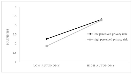 We tested the moderating effects using hierarchical regression analysis. Here, we used SPSS for two reasons. First, to test for multiple moderating effects, hierarchical regression analysis has been proven to be a better methodology for model fitness [106]. Second, the centered sums of the indicators are adopted in hierarchical regression analysis, which is regarded as more suitable than PLS. This is because PLS tends to overestimate the strength of relationships while underestimating their significance [107]. Therefore, to avoid unnecessary multicollinearity, the independent variables and moderators were calculated as mean-centered [108,109]. First, we processed the data on perceived privacy risk, autonomy, and happiness. Then, we added perceived privacy risk and autonomy into Model 1 and introduced the interaction item of perceived privacy risk and autonomy into Model 2. As Table 5 shows, perceived privacy risk positively moderated the relationship between autonomy and happiness (ΔR2 = 0.17, β = 0.135, t = 3.367, p < 0.01). As shown in Figure 3, the slope of the high level of perceived privacy risk was higher than that of the low level, rejecting H10. Similarly, we tested the moderating effect of perceived privacy risk on the relationship between timeliness and happiness, which is insignificant (ΔR2 = 0.003, β = 0.056, t = 1.331, p > 0.1), rejecting H11.