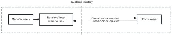 Under the direct mail mode, the overseas retailer receives the consumer’s order and can send the goods directly from the retailer’s in situ area to the overseas consumer. When a return occurs, the consumer sends the goods directly back to the retailer’s in situ area. This means that the direct mail mode involves cross-border logistics from the seller’s country to the purchaser’s country in the forward direction and from the purchaser’s country to the seller’s country in the reverse direction. This mode is beneficial for overseas retailers to avoid inventory risk, but it also incurs higher logistics costs []. The direct mail mode is shown in Figure 1.