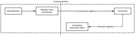 In the in situ destruction mode, the overseas retailer receives the consumer’s order and sends the goods directly from the retailer’s in situ area to the overseas consumer. When a return occurs, the consumer is required to send the goods directly to the centralized destruction office in their home country. That is, the in situ destruction mode involves cross-border logistics from the seller’s country to the purchaser’s country in the forward direction and centralized destruction office in the purchaser’s country in the reverse direction. The in situ destruction mode is shown in Figure 2.