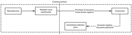 Under the return insurance mode, the overseas retailer will take out insurance on the goods and, upon receipt of the consumer’s order, will send the goods directly from the retailer’s local area to the overseas consumer. When a return occurs, the consumer is required to send the goods directly to a centralized collection point in their home country, and the insurer will then compensate the retailer for the loss suffered in connection with the return. This means that the forward logistics of the return insurance mode is the cross-border logistics from the seller’s country to the purchaser’s country, while the reverse logistics is the inbound logistics to the processing center in the purchaser’s country. The return insurance mode is shown in Figure 3.