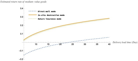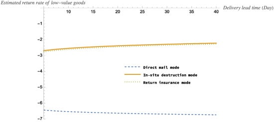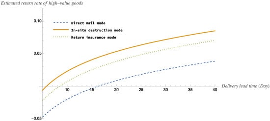 First, there are thresholds of the delivery lead time for all three modes (see Section 3.2 for details). Within the threshold range, customers may choose to return the goods because of the extended delivery lead time [,]. Outside of the threshold range, consumers usually do not choose to return the goods, but consumers may not purchase again. After analyzing the estimated return rate, the in situ destruction mode has the largest estimated return rate, while the direct mail mode has the smallest estimated return rate.