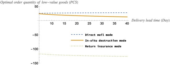 According to Figure 4 and Figure 5, for low-value goods, the estimated return rate of the goods will decrease as the delivery lead time increases and the optimal order quantity will increase as the delivery lead time increases under the direct mail mode, while the estimated return rate will increase as the delivery lead time increases and the optimal order quantity will decrease as the delivery lead time increases under the in situ destruction and return insurance modes. Specifically, we have made the following findings: Firstly, the return process is cumbersome for the consumer due to the low value of the goods. Thus, when consumers receive the goods, they want to return them but forgo returning them because they are too low value. As a result, in the case of low-value goods, the estimated return rate is negative for all three modes. Secondly, the estimated return rate is greatest for the in situ destruction mode and lowest for the direct mail mode. Thirdly, the optimal order quantity is greatest for the direct mail mode and lowest for the return insurance mode. Since the optimal order quantity for the return insurance mode is always less than zero, it is not recommended to purchase insurance for goods when the value of the goods is low.