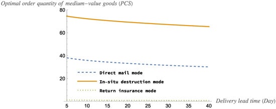 According to Figure 8 and Figure 9, for high-value goods, the estimated return rate of the goods will increase as the delivery lead time increases in all three modes. And the optimal order quantity will decrease as the delivery lead time increases in all three modes. Specifically, we have made the following findings: Firstly, the estimated return rate is greatest for the direct mail mode and lowest for the in situ destruction mode. The estimated return rate values for all modes is significantly smaller for high-value goods than for medium- and low-value goods. This means that high prices can limit consumers’ returns. Secondly, the threshold for the in situ destruction mode is around 5 days, the threshold for the return insurance mode is around 8 days, and the threshold for the direct mail mode is around 16 days. This means that if the retailer can deliver the item within the threshold, then the consumer will not return it due to time preference. Conversely, if the goods are delivered after the threshold has been exceeded, there is a risk that the consumer may be less inclined to purchase the goods or reverse the purchase due to time preference. Thirdly, the optimal order quantity is greatest for the direct mail mode and lowest for the in situ destruction mode. Fourthly, for the same delivery lead time, a mode with a lower estimated return rate also has a higher optimal order quantity. This means that a lower estimated return rate results in fewer items being available for secondary sales, so retailers need to order more items to keep up with market demand.