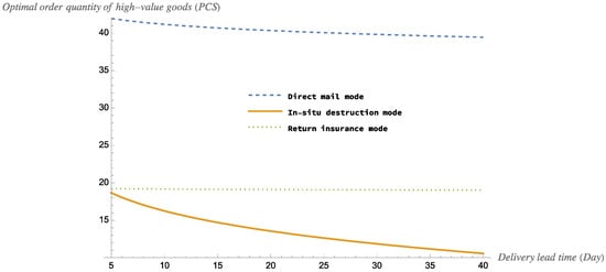 According to Figure 6 and Figure 7, for medium-value goods, the estimated return rate of the goods will increase as the delivery lead time increases in all three modes. And the optimal order quantity will decrease as the delivery lead time increases in all three modes. Specifically, we have made the following findings: Firstly, the estimated return rate is greatest for the in situ destruction mode and lowest for the direct mail mode. This means that if the retailer can deliver the item within 23 days, the consumer will not return it because of time preferences. Therefore, if retailers want to reduce the estimated return rate, they should strictly control the clearance of goods, as well as the logistics time (e.g., by choosing faster logistics methods). Thirdly, the optimal order quantity is greatest for in situ destruction mode and lowest for the return insurance mode. Fourthly, the estimated return rate is highest for the in situ destruction mode because the goods are destroyed and cannot be re-sold, so retailers also have the highest order quantity in the in situ destruction mode to avoid running out of stock.