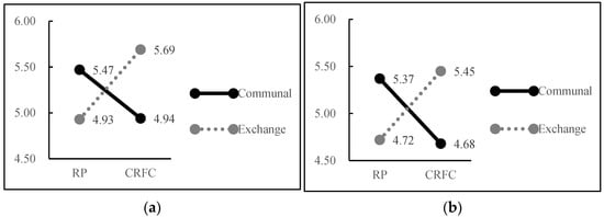 Contrast analysis revealed that exchange participants had a higher repurchase intention in response to a CRFC (vs. RP) card (MCRFC-E = 5.69, SD = 1.41; MRP-E = 4.93, SD = 1.76; F(1, 231) = 9.04, p = 0.003). Communal participants reported a lower repurchase intention in response to a CRFC (vs. RP) card (MCRFC-C = 4.94, SD = 1.17; MRP-C = 5.47, SD = 1.09; F(1, 231) = 4.57, p = 0.034). Additionally, exchange participants reported a higher repurchase intention than communal participants in response to a CRFC card (MCRFC-E = 5.69, SD = 1.41, MCRFC-C = 4.94, SD = 1.17; F(1, 231) = 9.46, p = 0.002). However, exchange participants reported a lower repurchase intention than communal participants in response to an RP card (MRP-E = 4.93, SD = 1.76, MRP-C = 5.47, SD = 1.09; F(1, 231) = 4.42, p = 0.037; see Figure 3a).